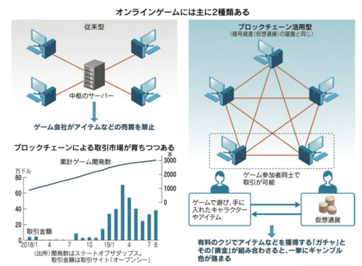 >「暗号資産(仮想通貨)の基盤となるブロックチェーンを活用したオンラインゲームが急増している。仮想通貨の取引から派生した技術だけに、ゲームで獲得したアイテムなどを他の人と売買できる仕組みが備わっているのが特徴だ。従来のゲームでは利用者間のお金のやり取りはタブーだったが、新技術が状況を変えた。」