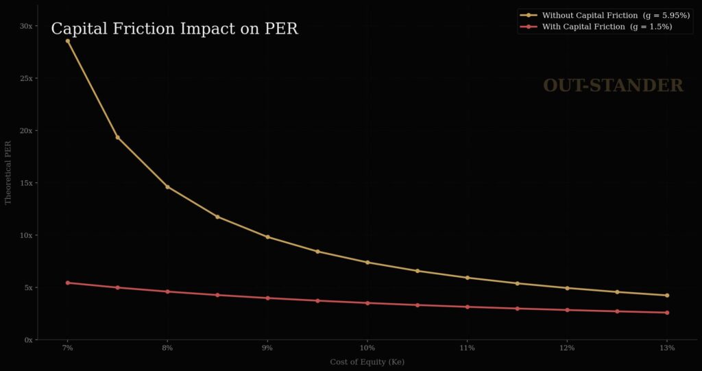 成長率=ROE×(1−配当性向)−【資本摩擦】
