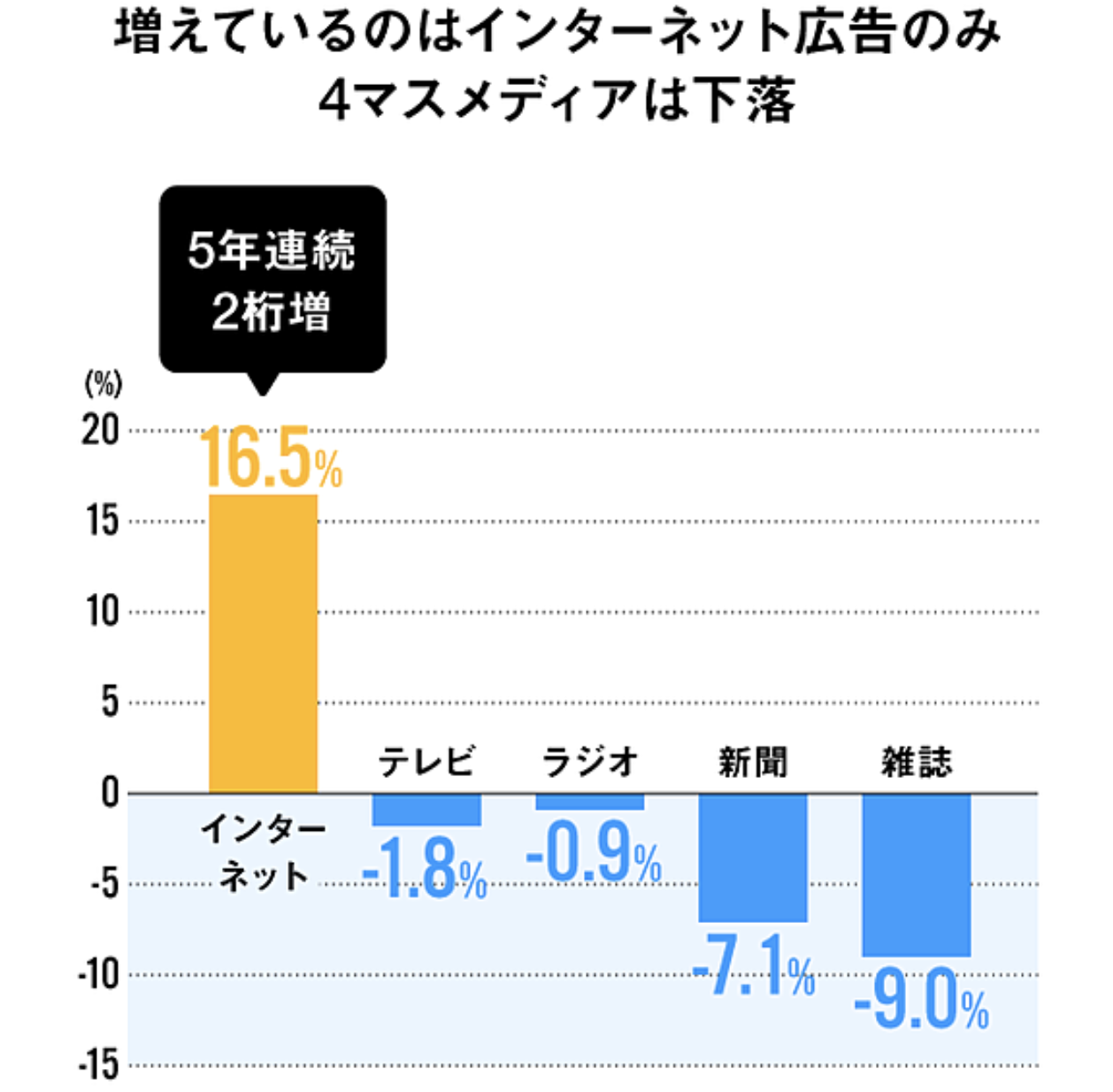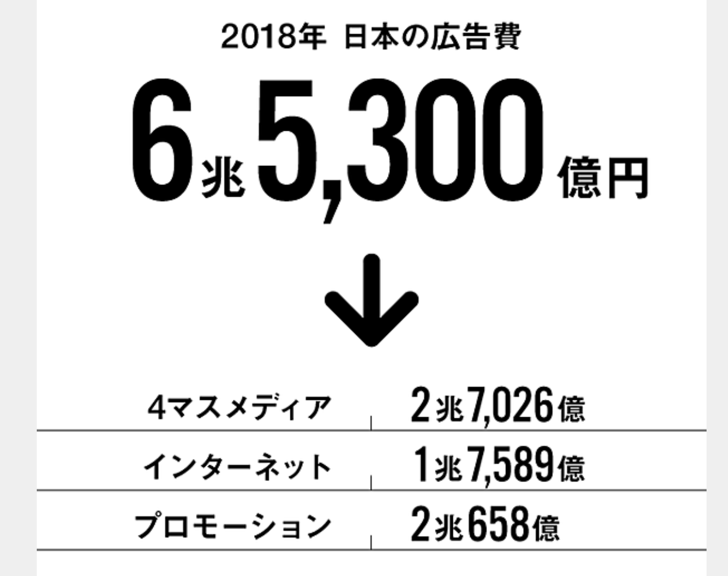 今は4大メディア(テレビ・新聞・雑誌・ラジオ)への広告が2兆7千億円で、インターネットへの広告が1兆7千億円となっています。しかし、4大メディアへの広告は減り続け、インターネットへの広告は増え続けていることからすると、逆転していくのは、まさに時間だけの問題です。なぜなら、4大メディアは、