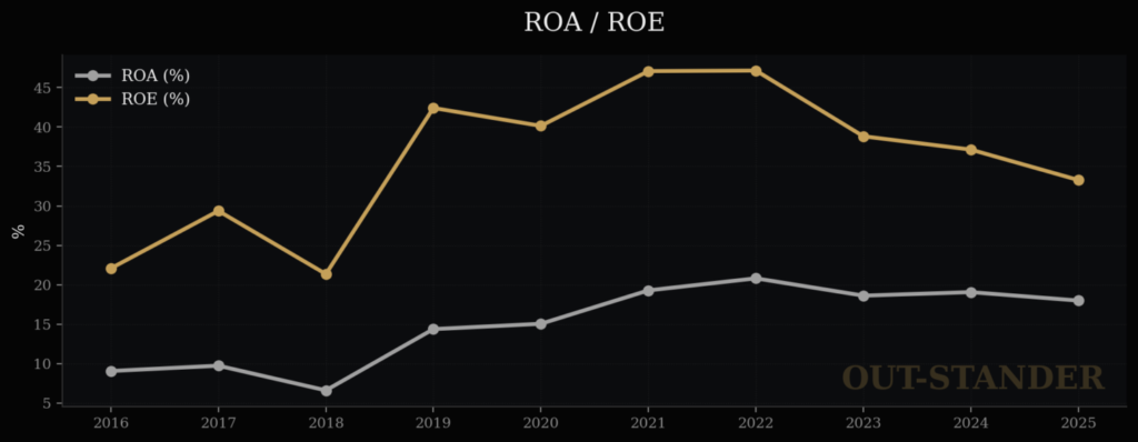 ・ROE(自己資本利益率)が22年を頂点に下落傾向